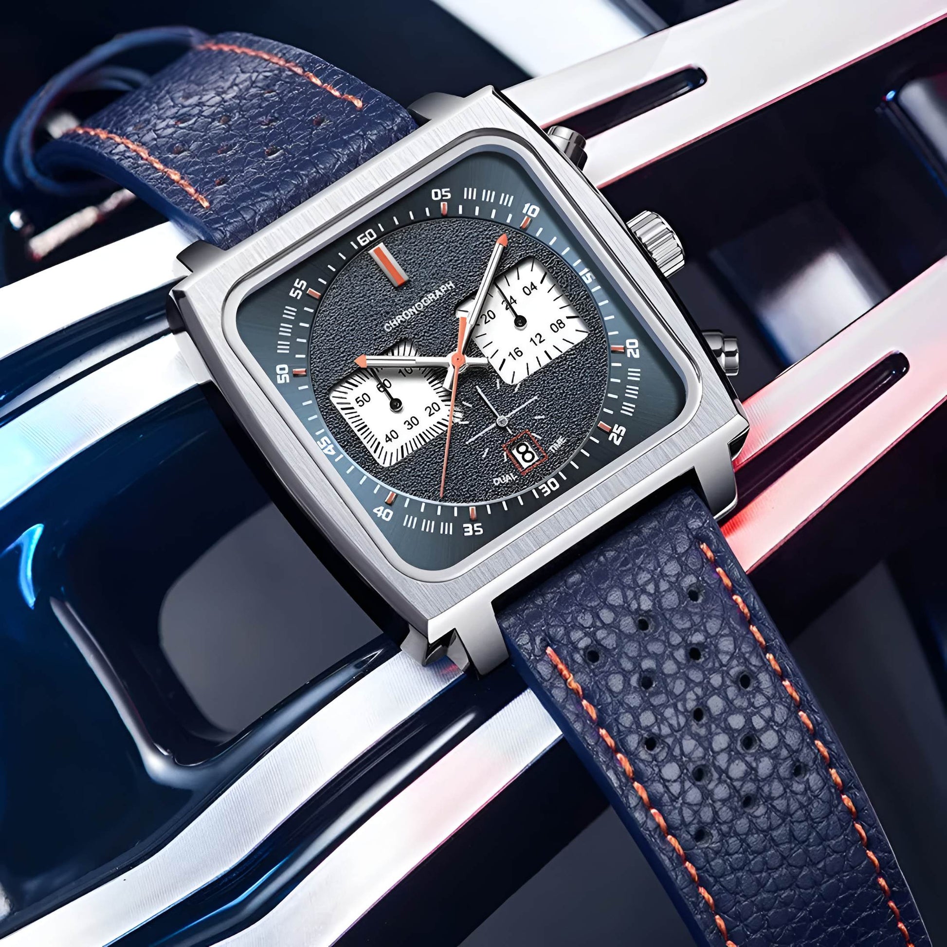 Powered by a precise quartz movement, the ASTRON watch ensures accurate timekeeping while offering multiple functionalities. With a complete calendar and luminous hands, you can rely on this watch for both day and night use. The square-shaped case, paired with a 43mm dial diameter, gives this watch a bold and modern aesthetic. The Hardlex dial window is built for scratch resistance, allowing the watch to maintain its pristine look over time.