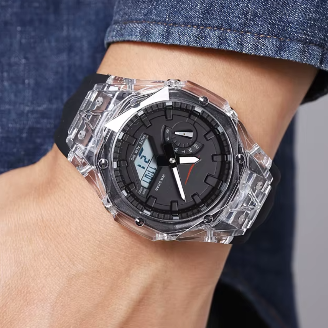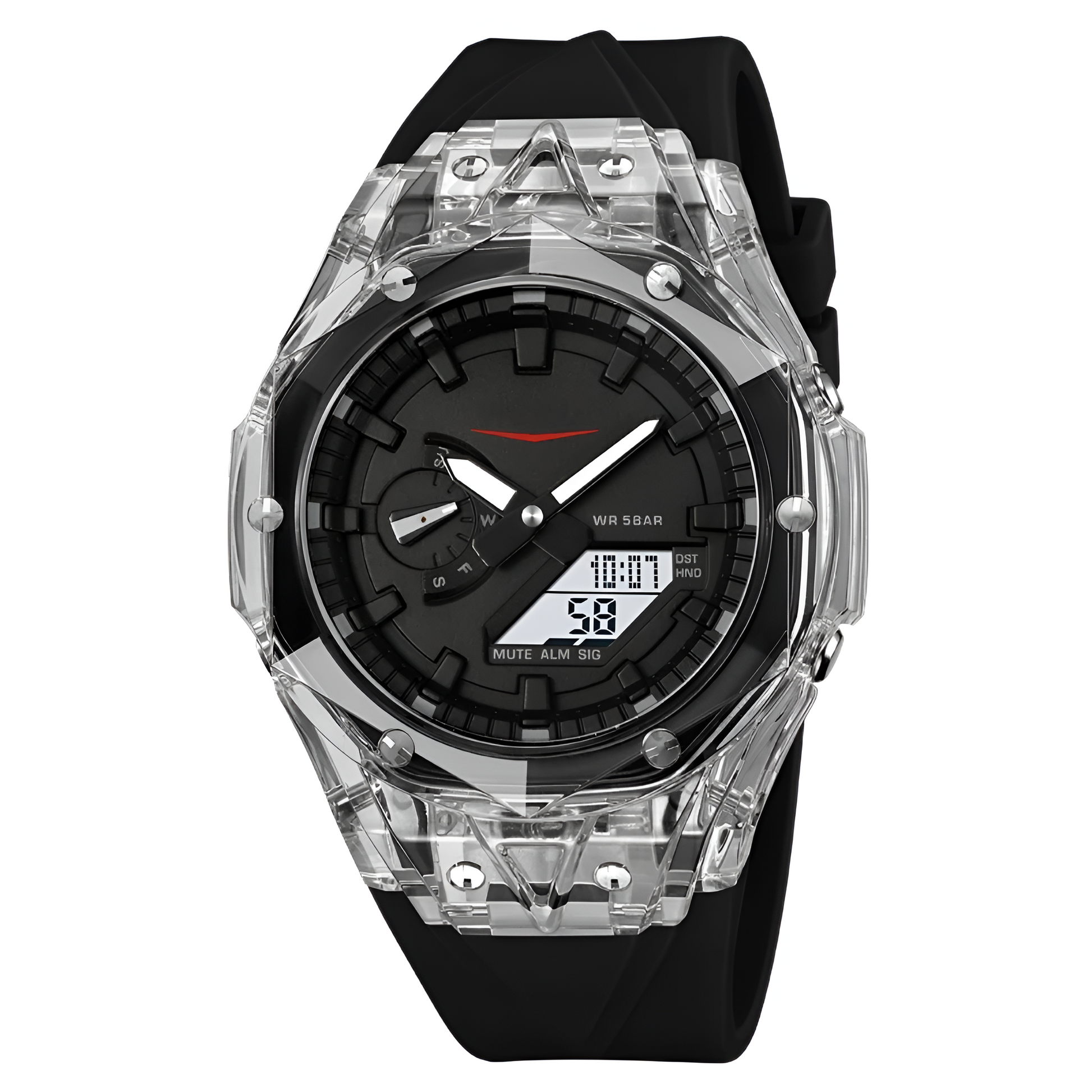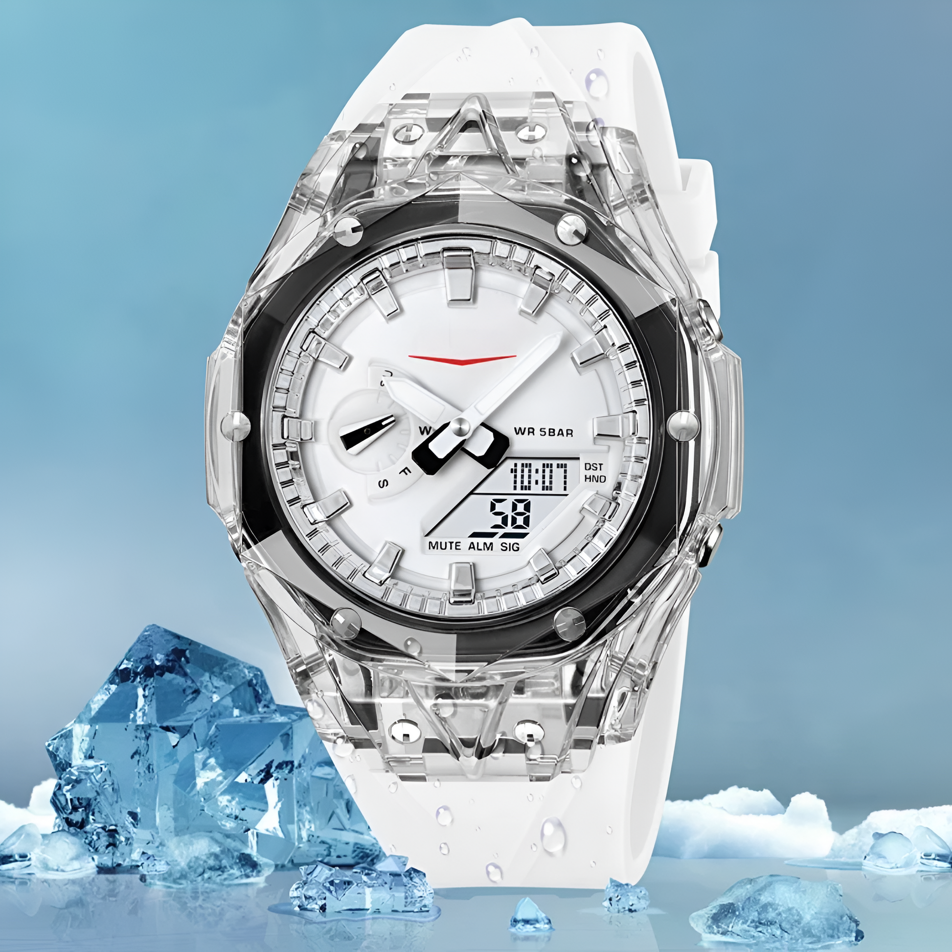 • Materials: Polycarbonate case, silicone strap, 5 Bar water resistance