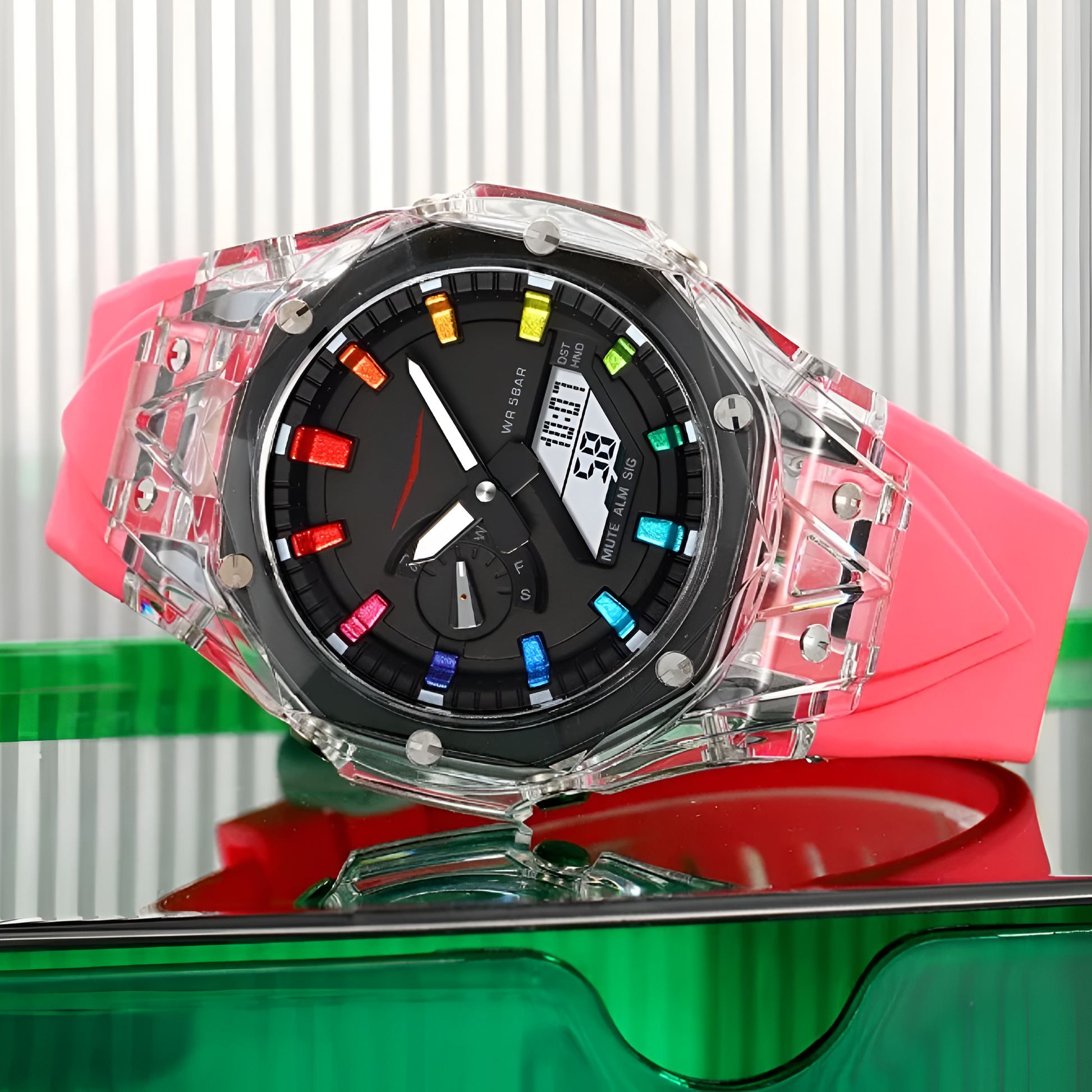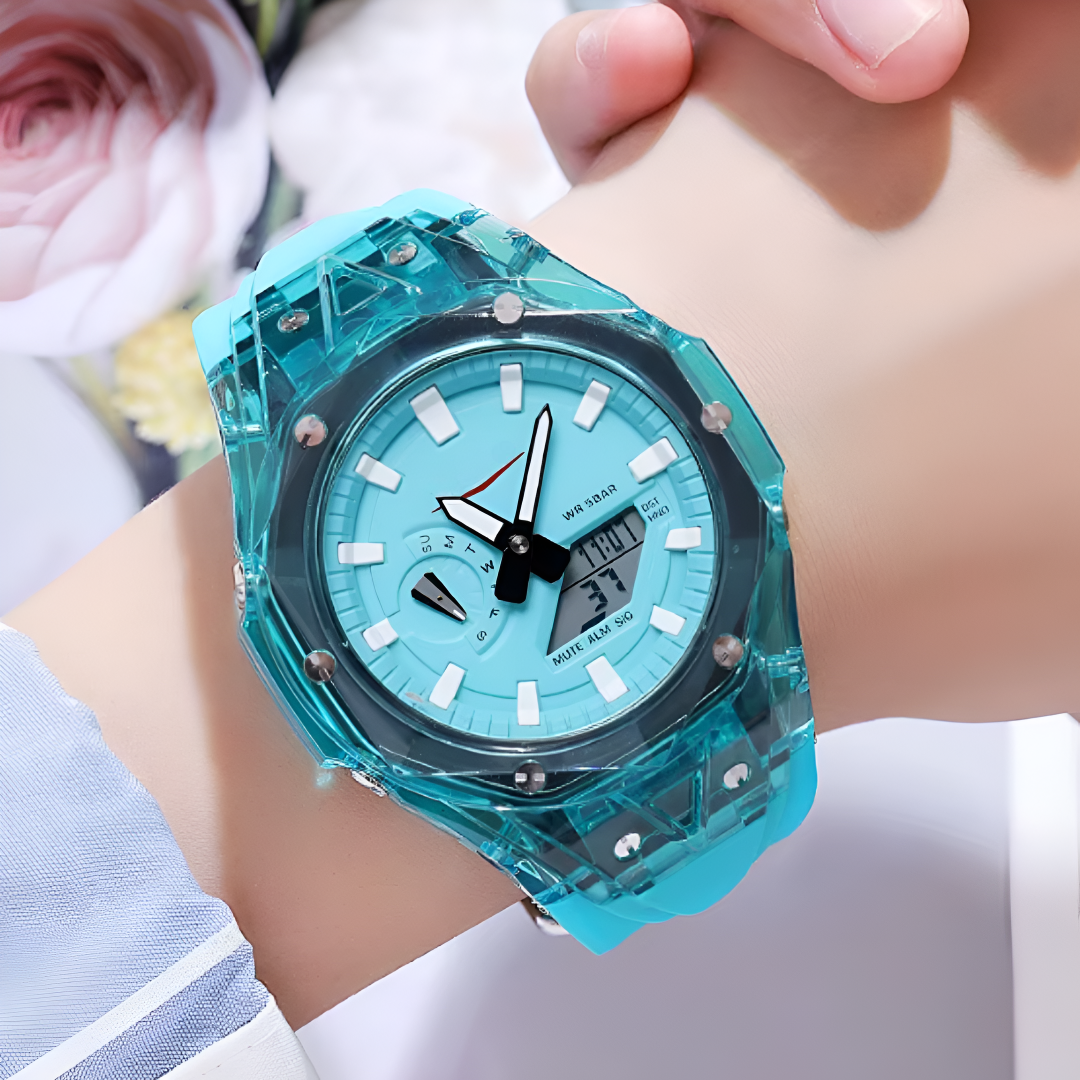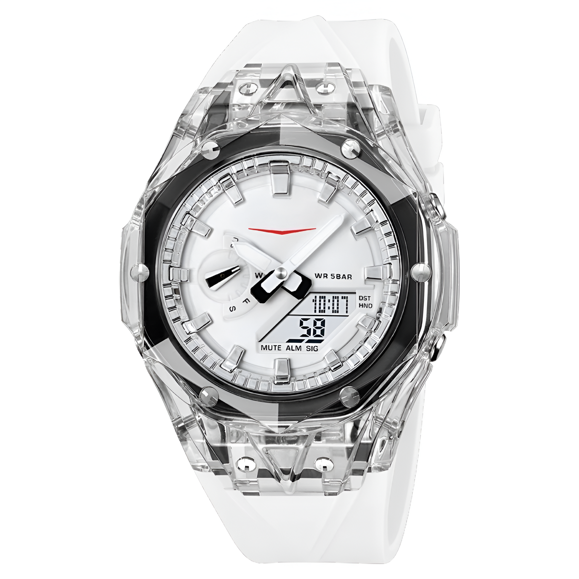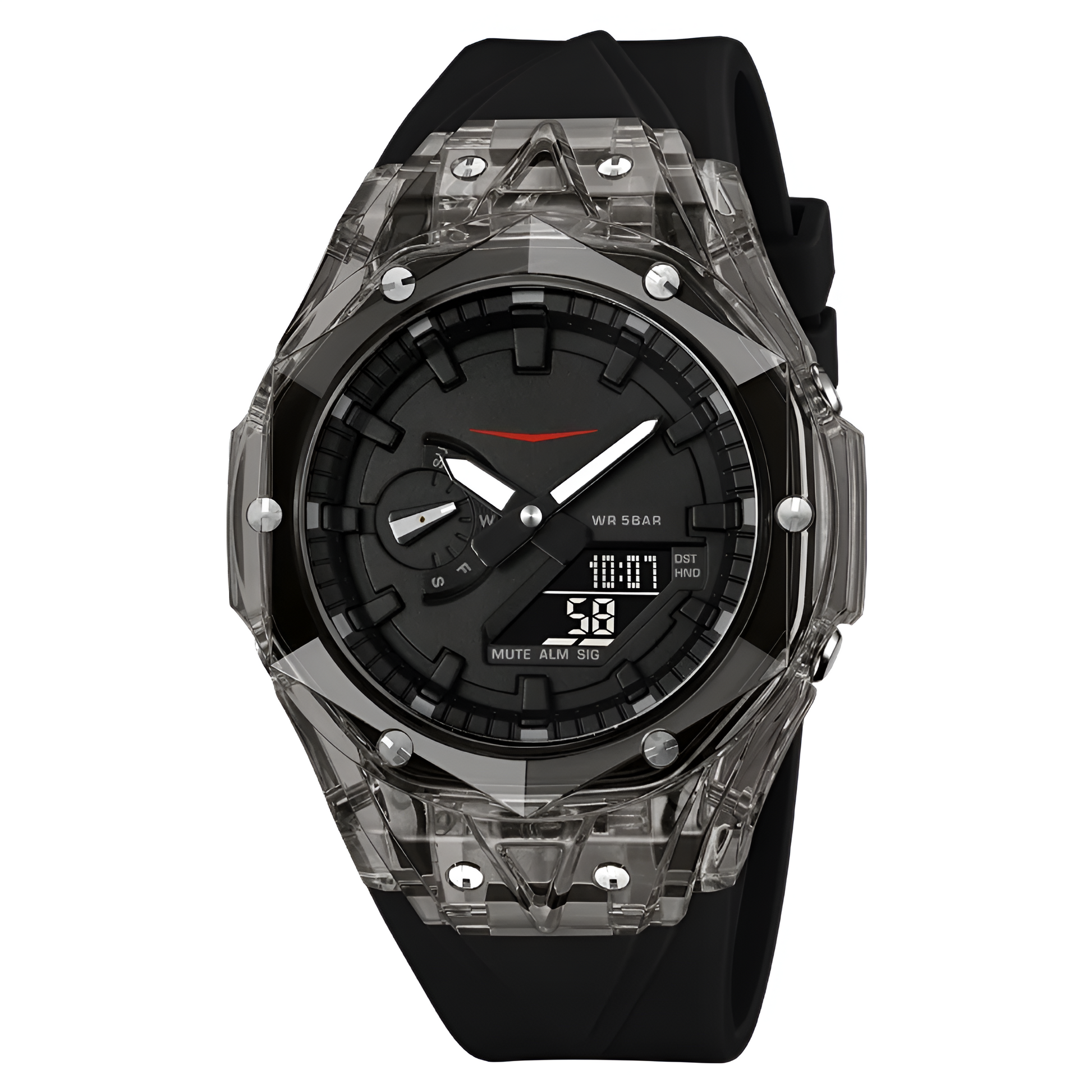 • Materials: Polycarbonate case, silicone strap, 5 Bar water resistance