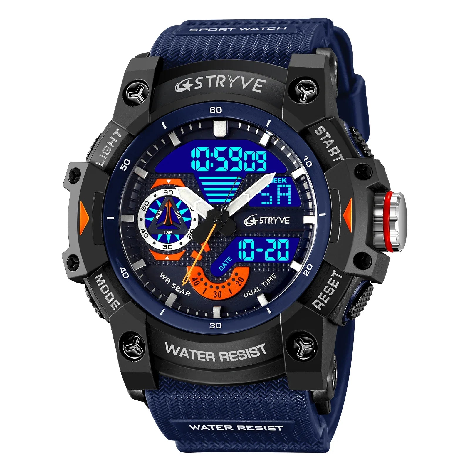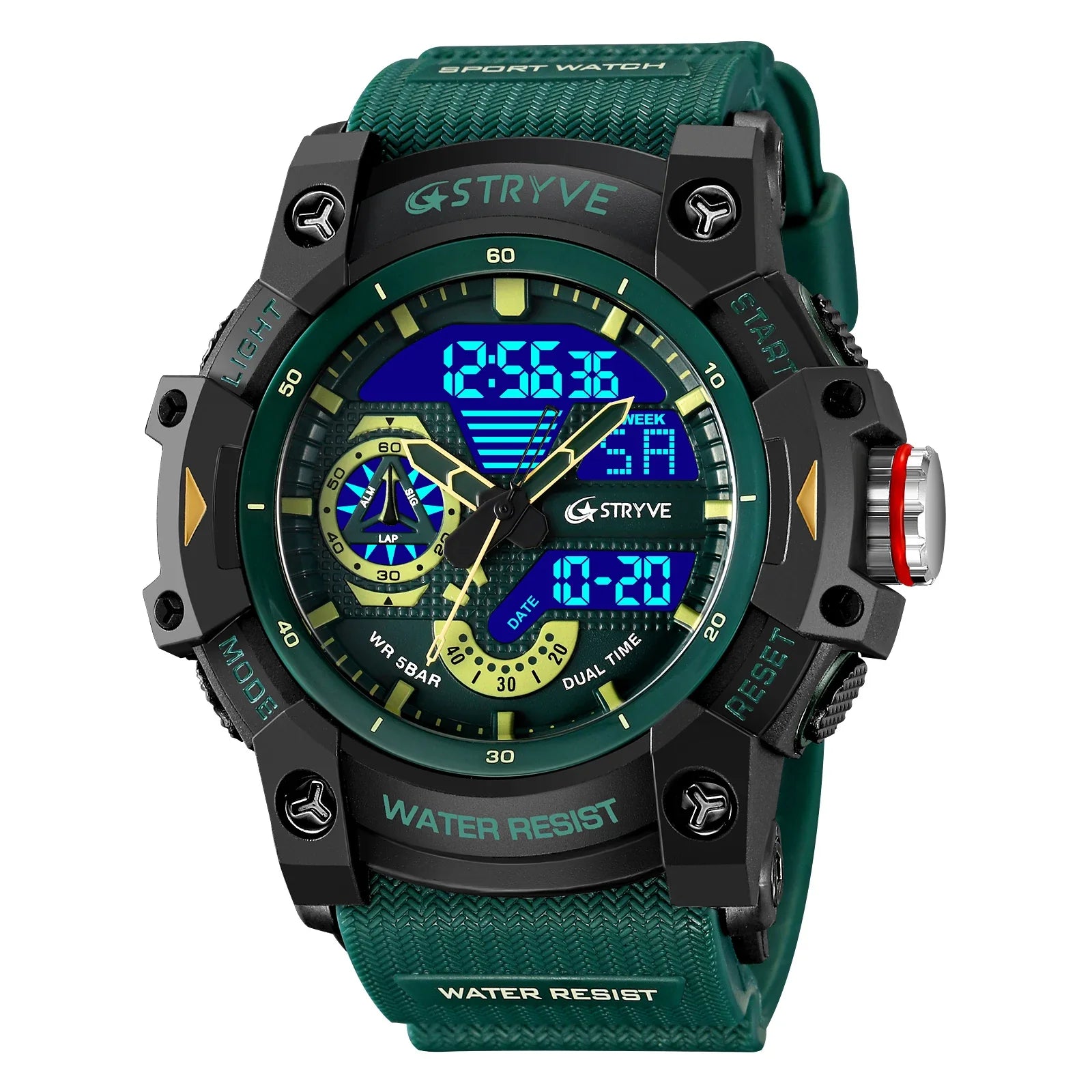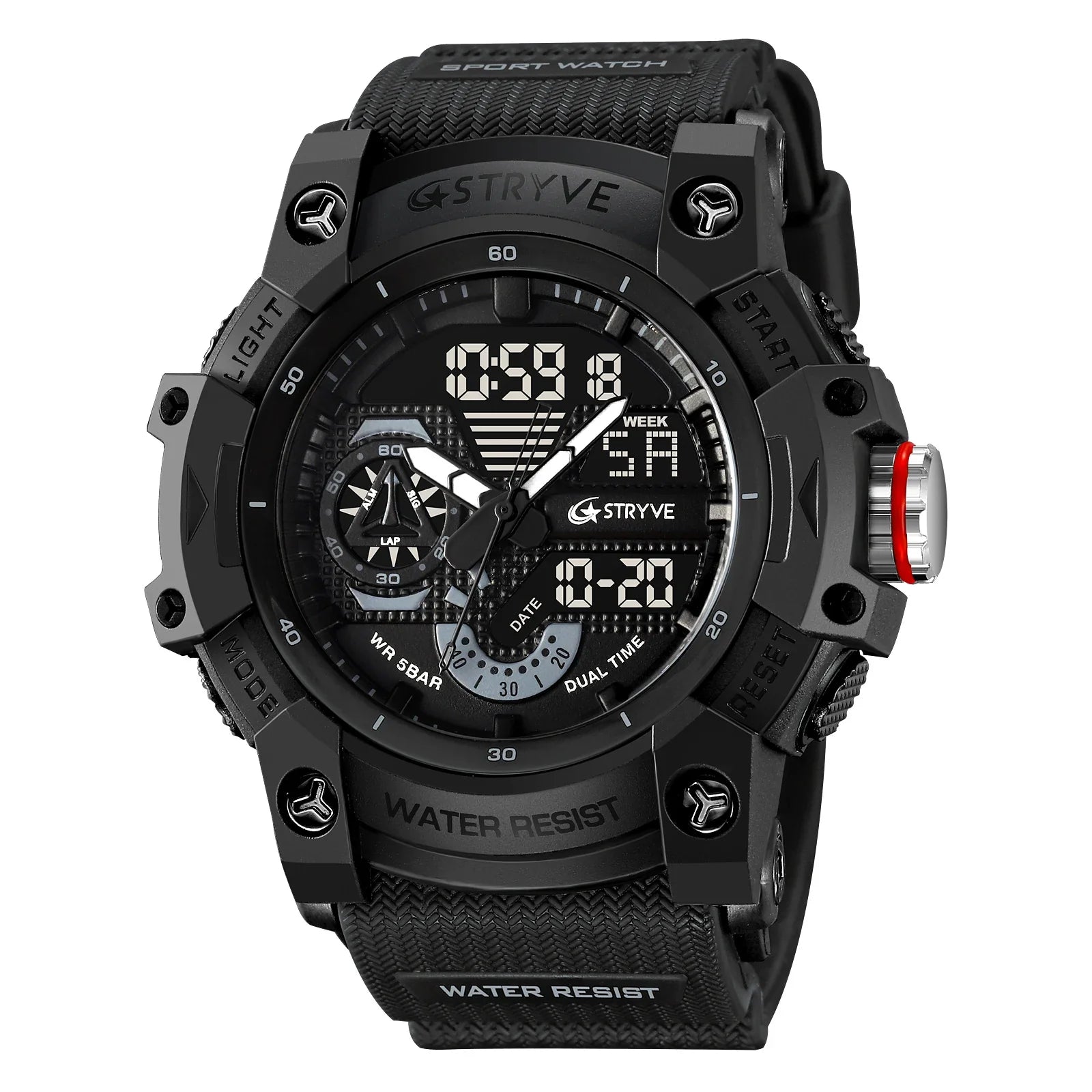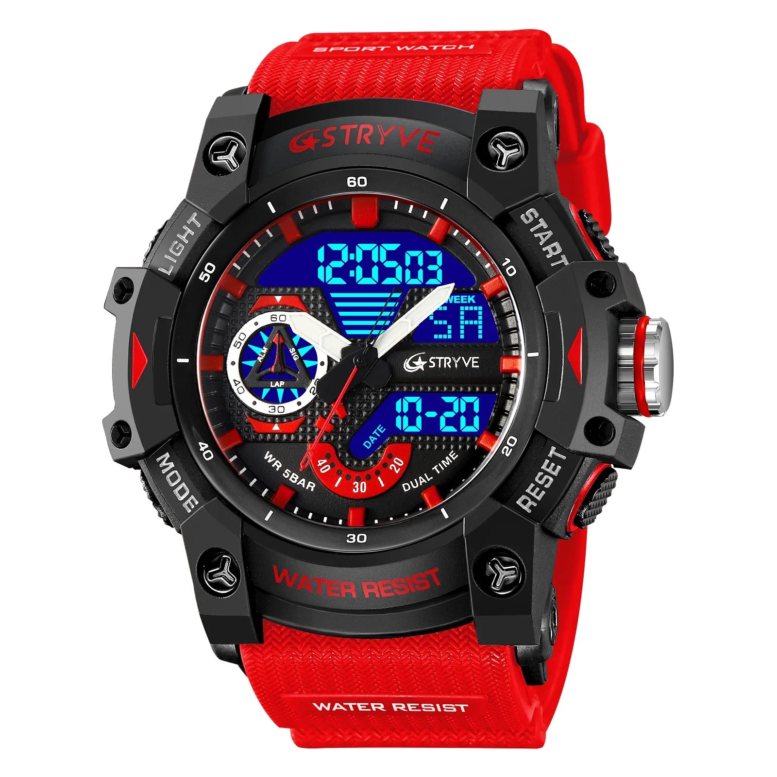 • Materials: Polycarbonate case, Silicone strap, 5 Bar water resistance