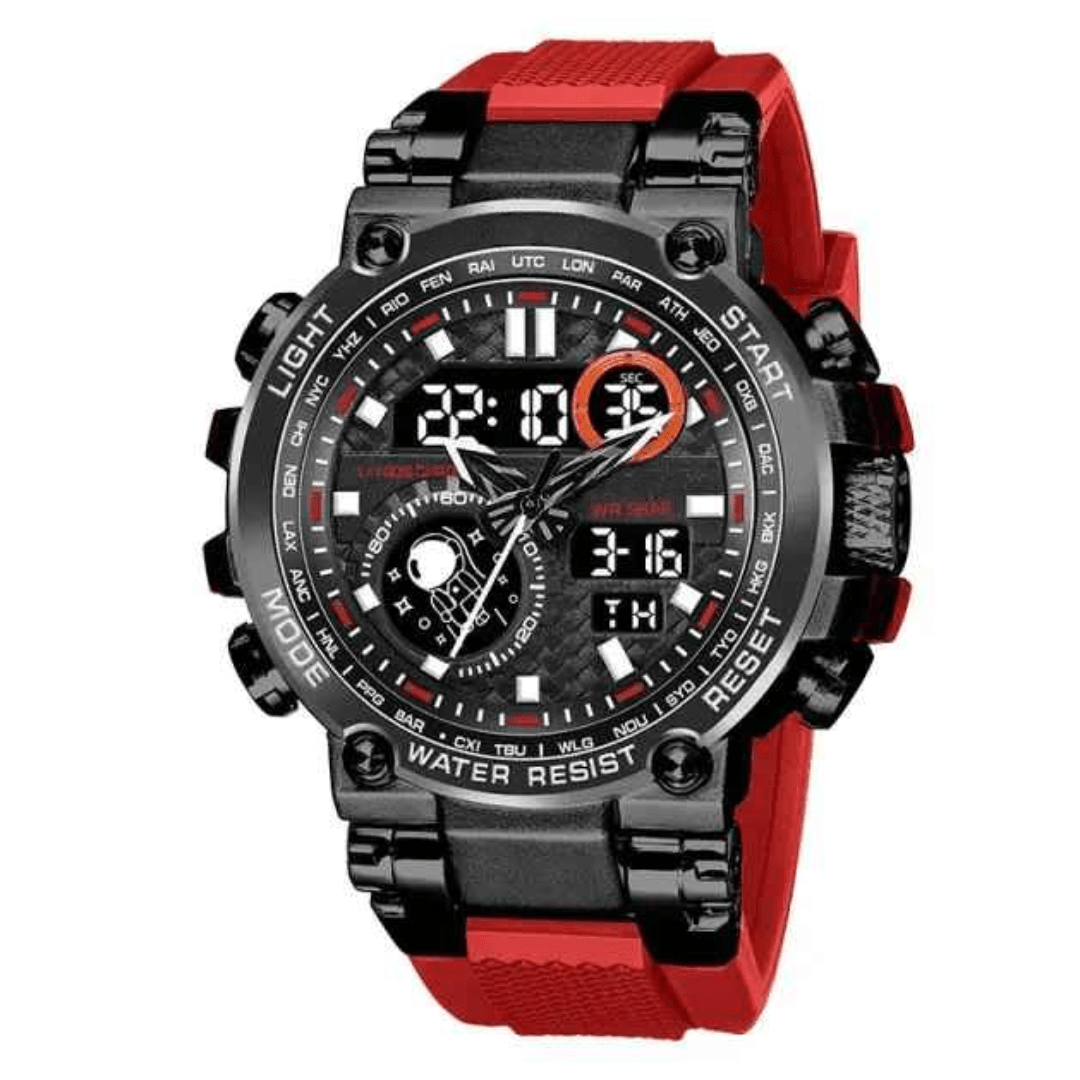 Built for durability, this waterproof sport watch features a 46mm case and 20mm band width. With analog and digital displays, it includes a complete calendar, stopwatch, multiple time zones, and a luminous backlight. Shock-resistant, ideal for an active lifestyle.