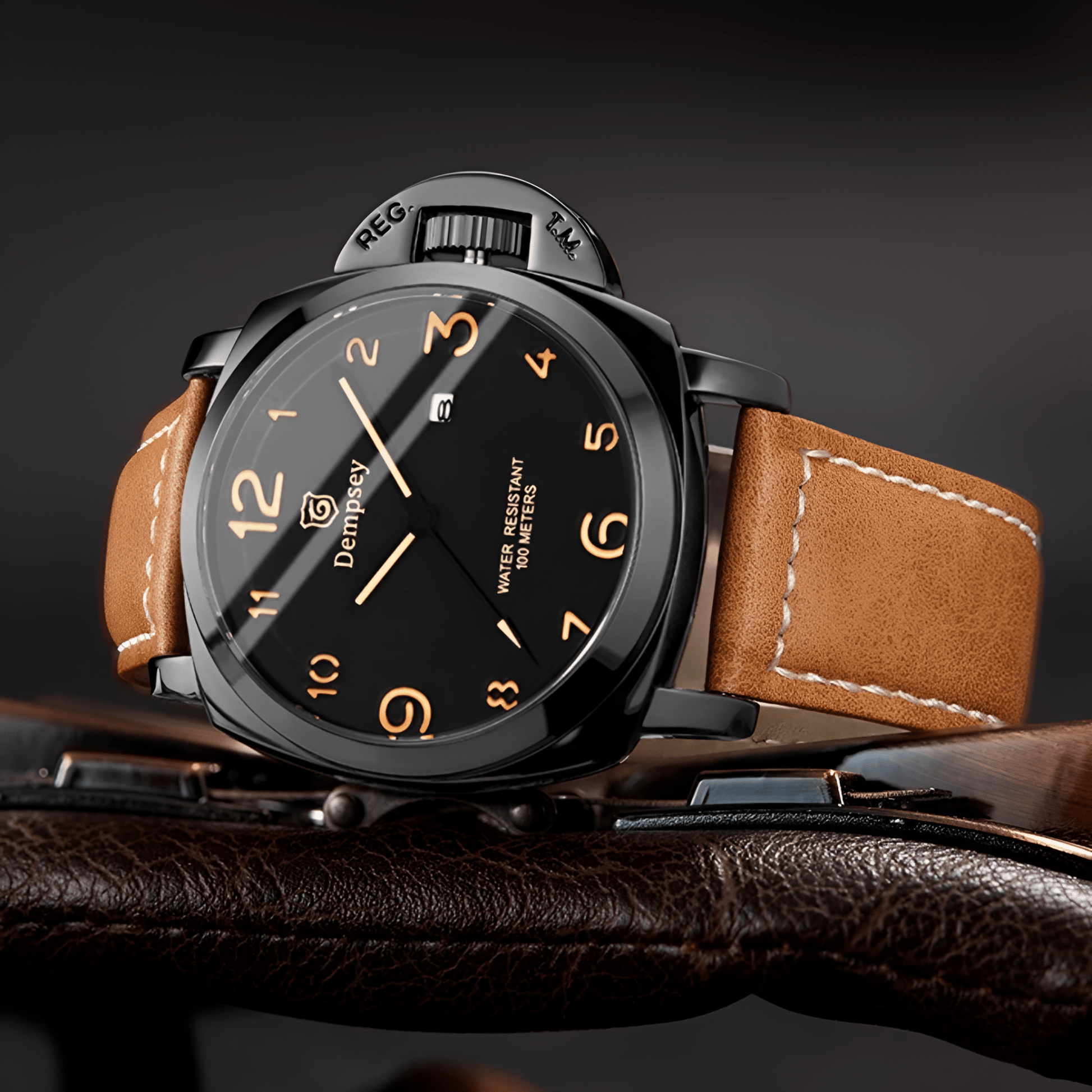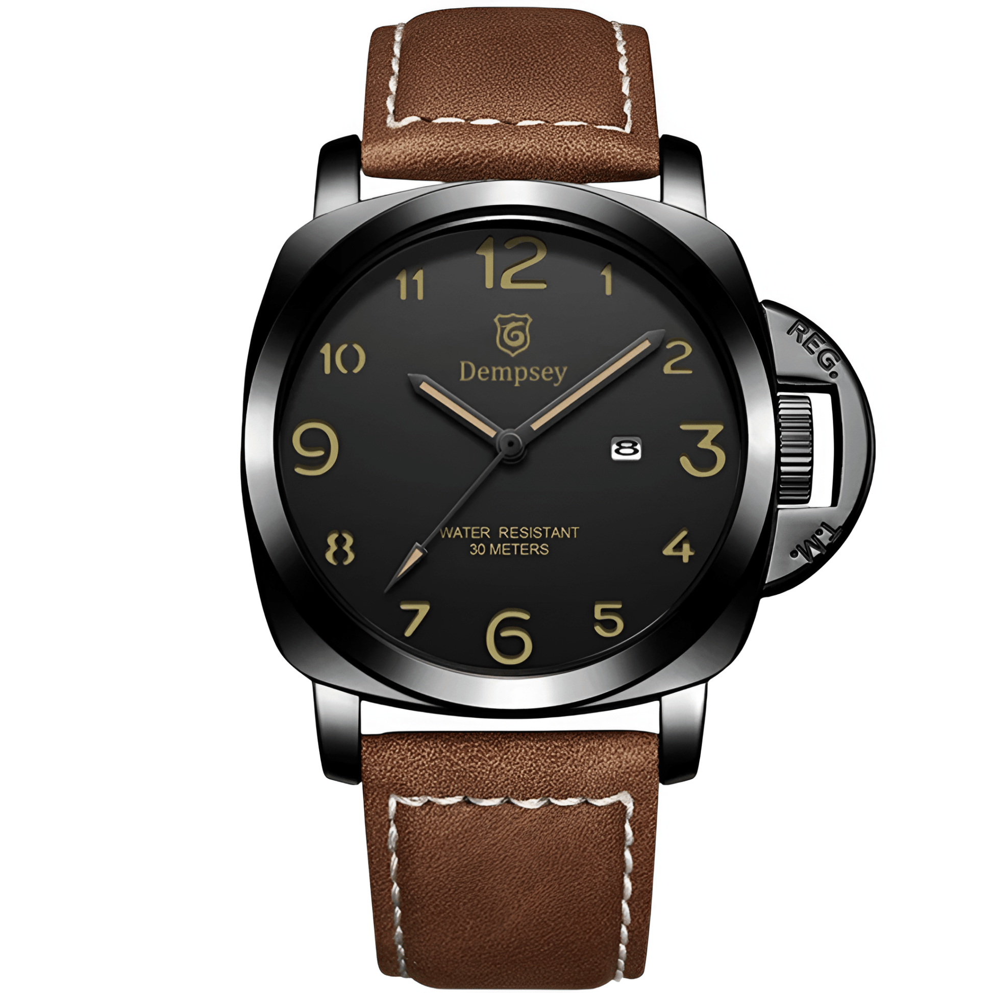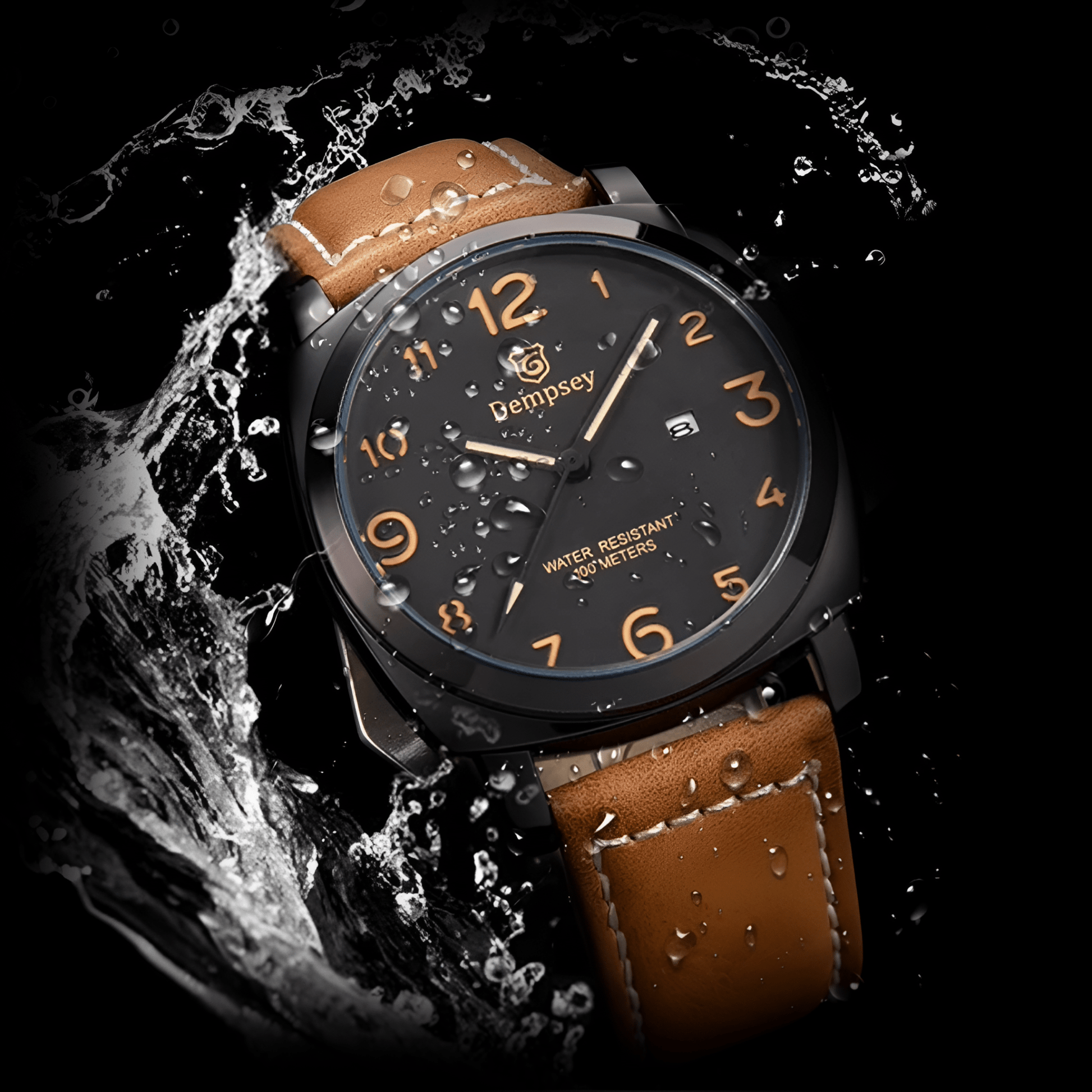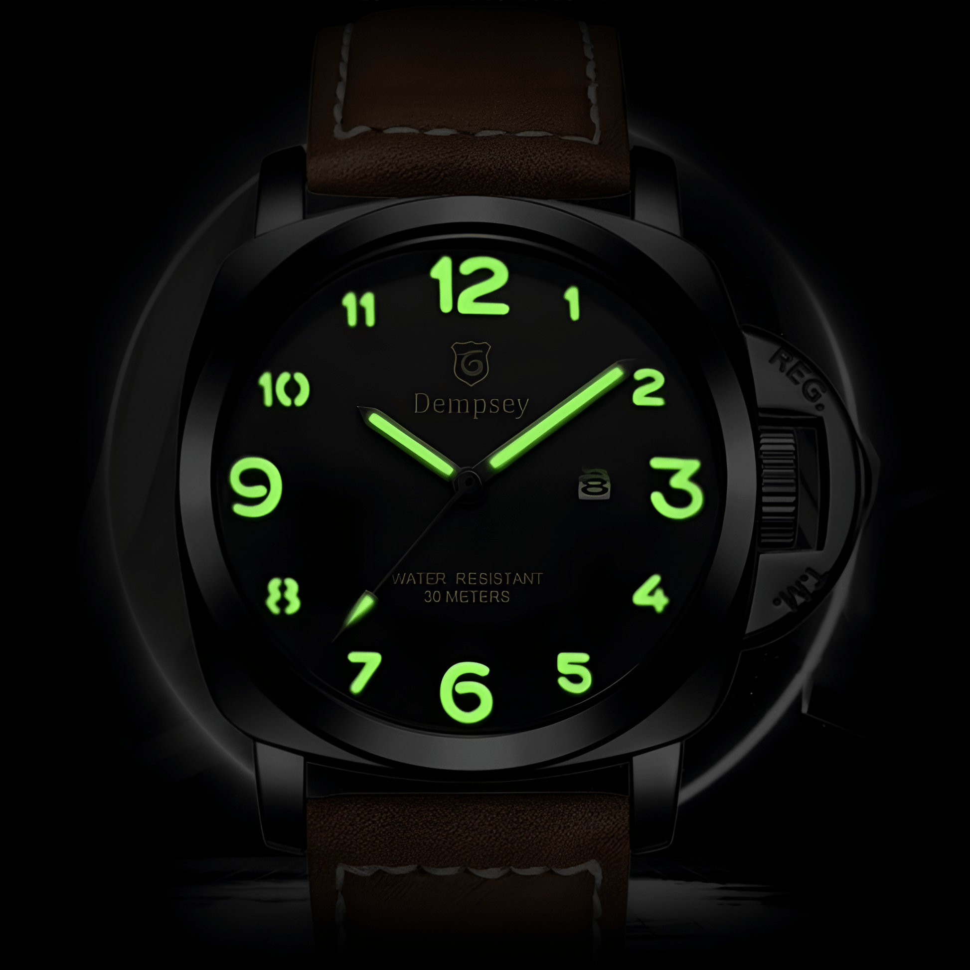 • Materials: Stainless Steel case, Leather strap, 10 Bar water resistance