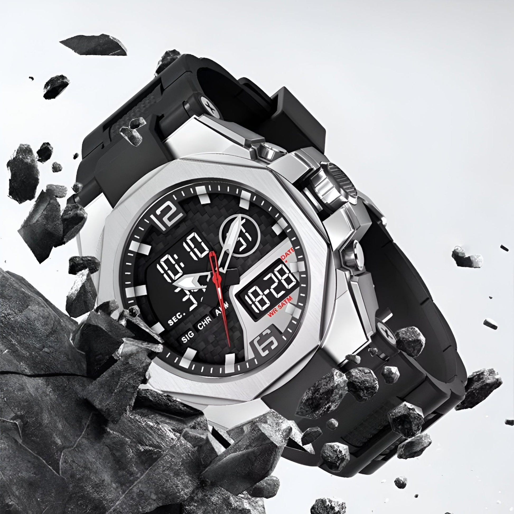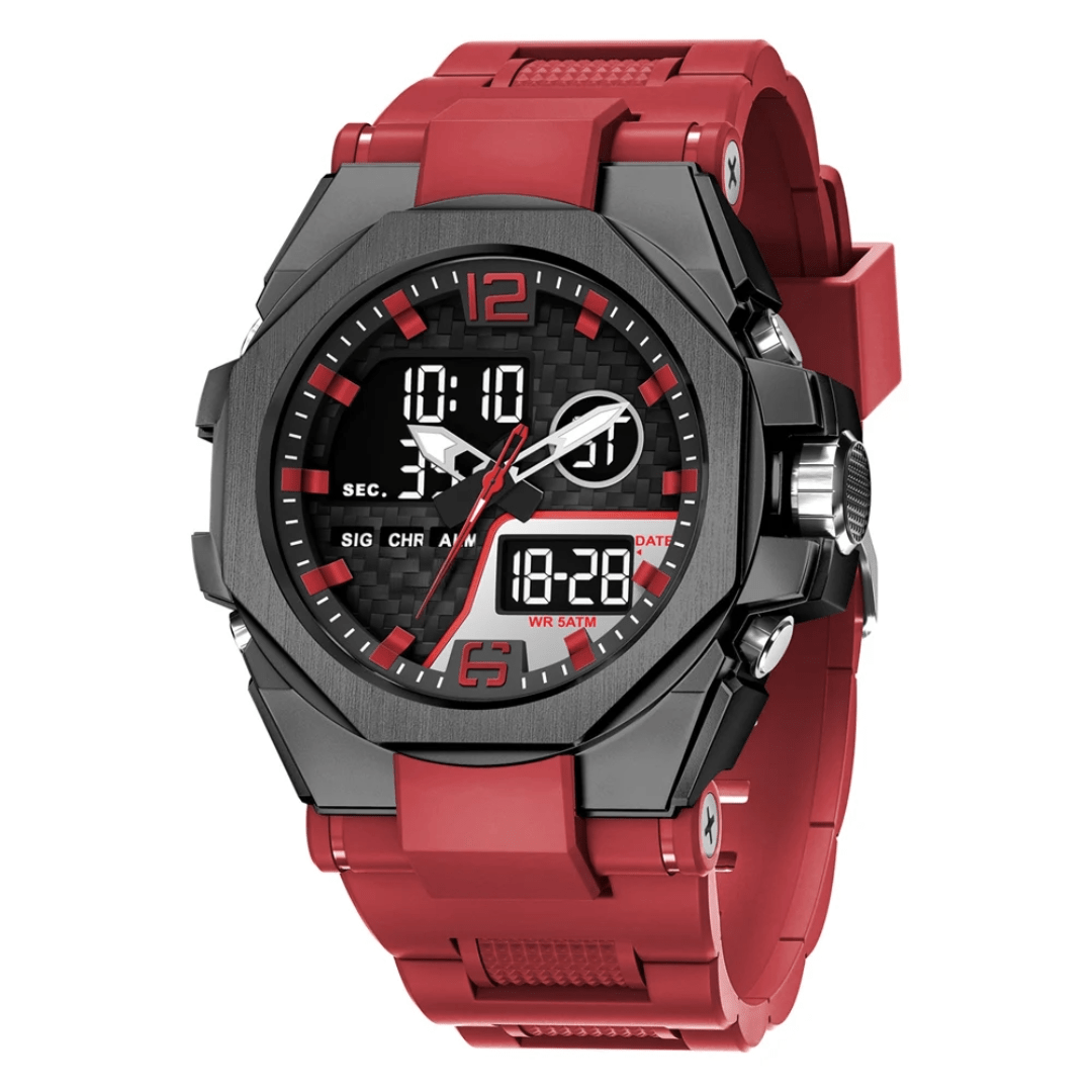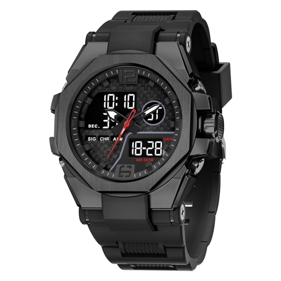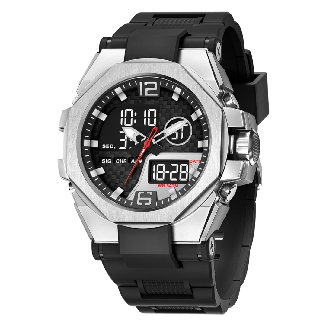 Designed for those who demand more from their timepiece, the VORYS Pro Chrono combines rugged durability with cutting-edge functionality. Its bold 50mm round alloy case houses a dual-display quartz movement, seamlessly blending analog elegance with digital versatility. The silicone band ensures all-day comfort, while the buckle clasp adds security during any activity.