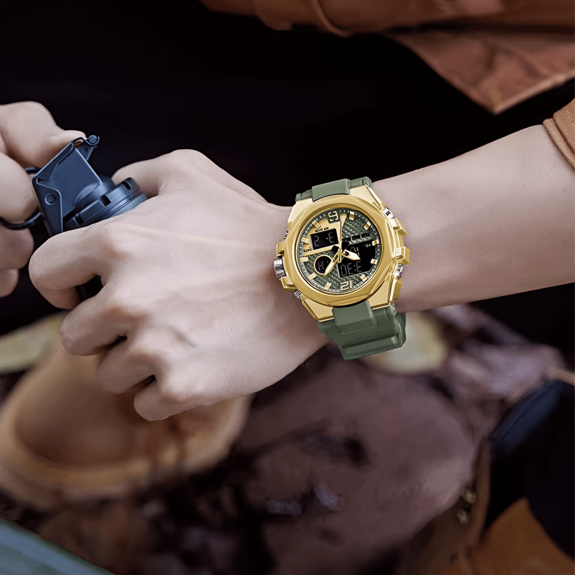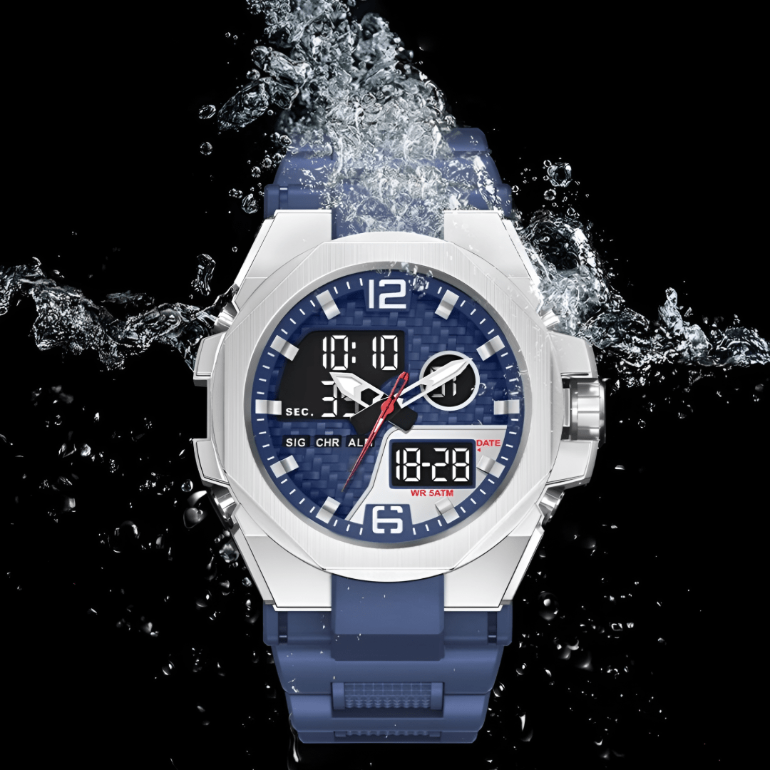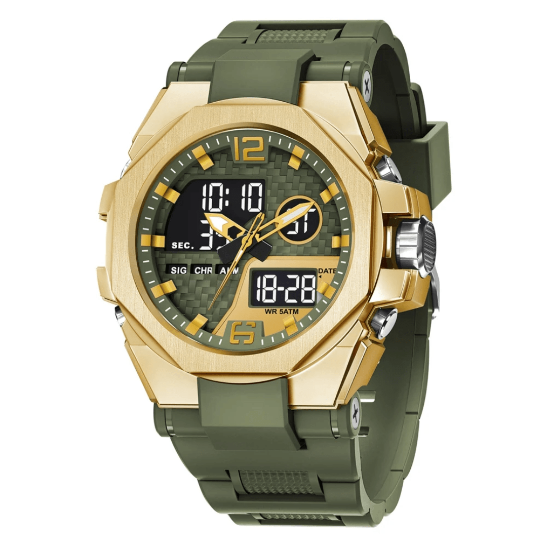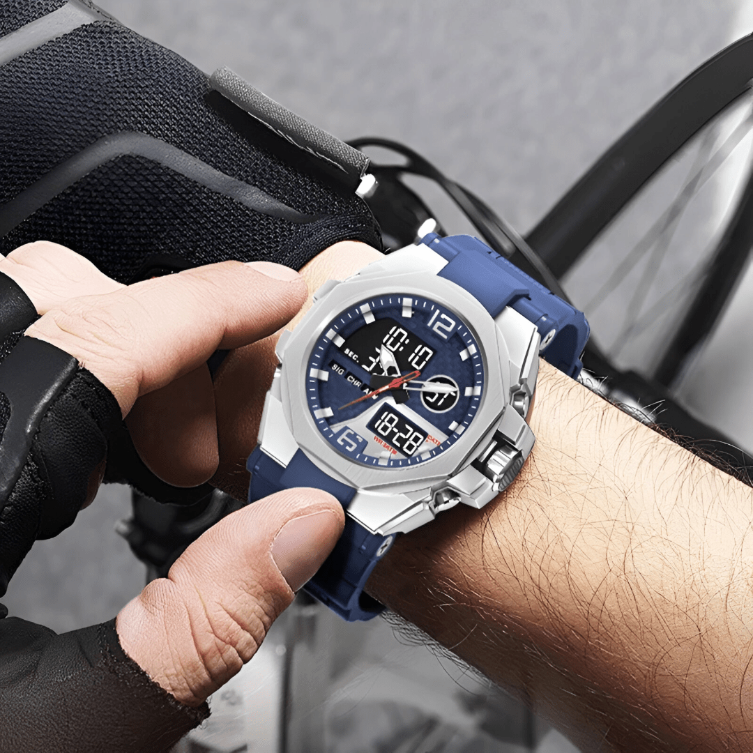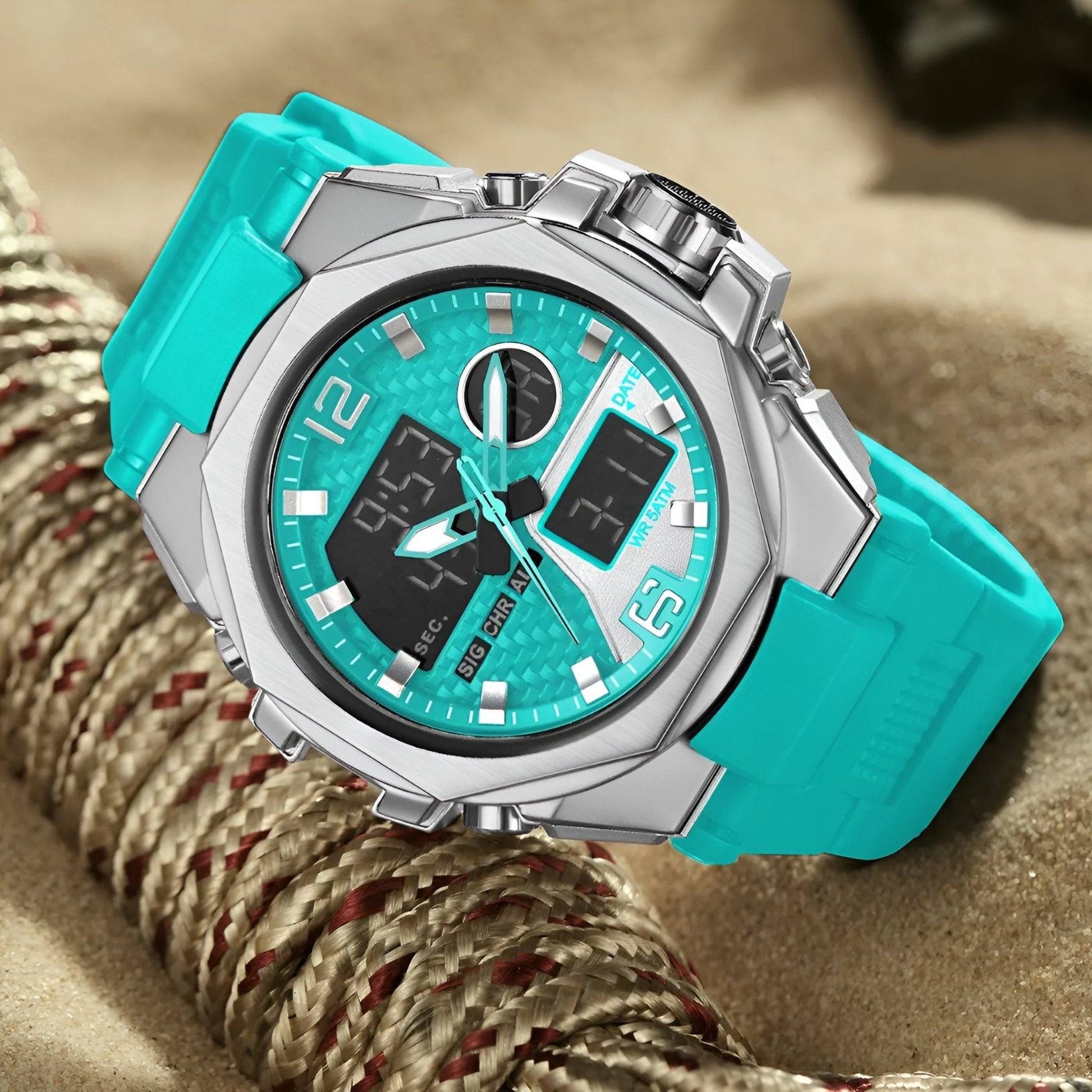 Designed for those who demand more from their timepiece, the VORYS Pro Chrono combines rugged durability with cutting-edge functionality. Its bold 50mm round alloy case houses a dual-display quartz movement, seamlessly blending analog elegance with digital versatility. The silicone band ensures all-day comfort, while the buckle clasp adds security during any activity.