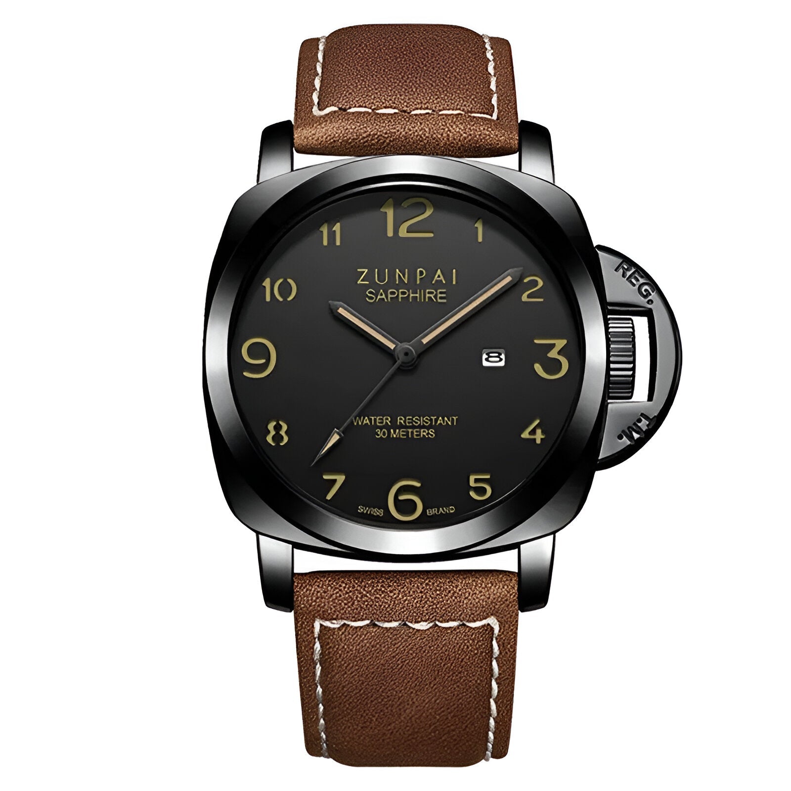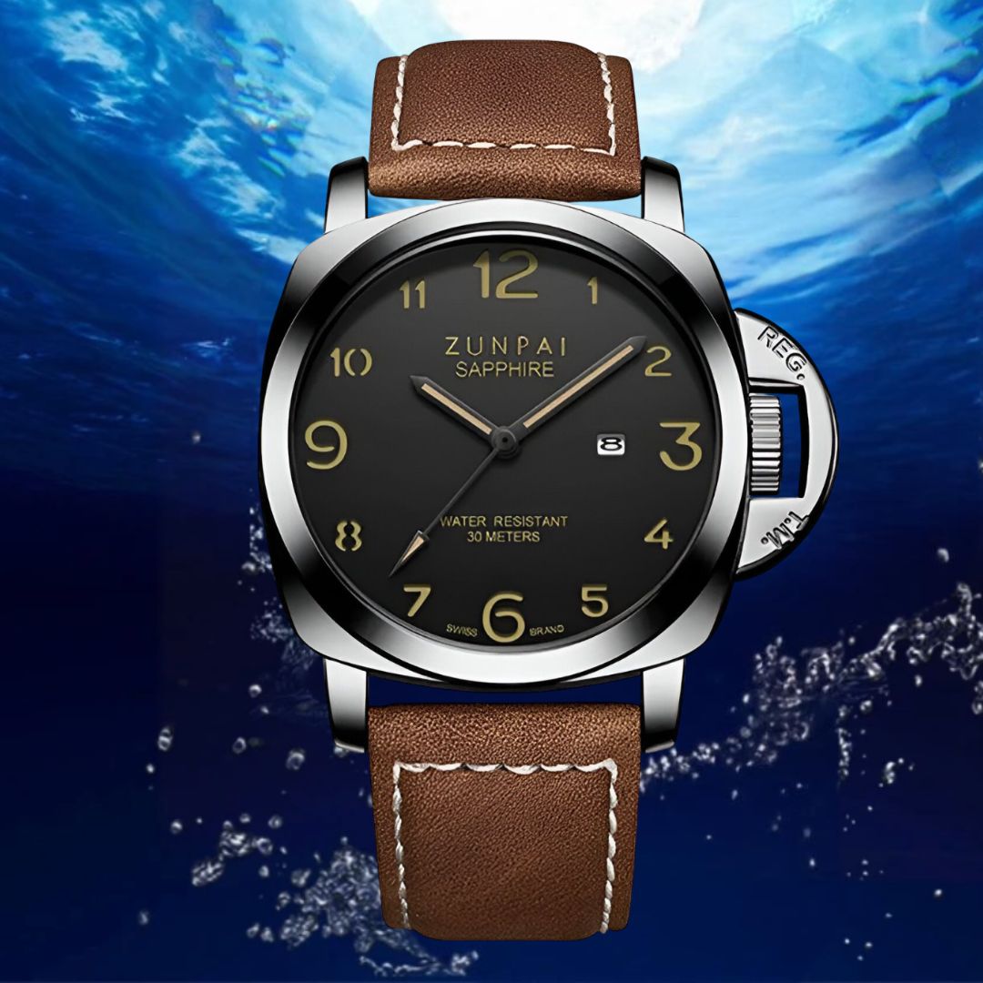 • Materials: Stainless Steel case, Leather strap, 3 Bar water resistance